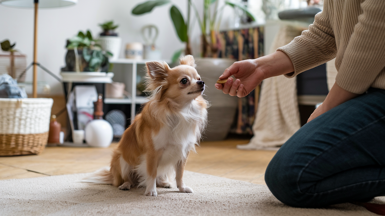 - 짖는 것을 멈추면 간식으로 보상합니다.